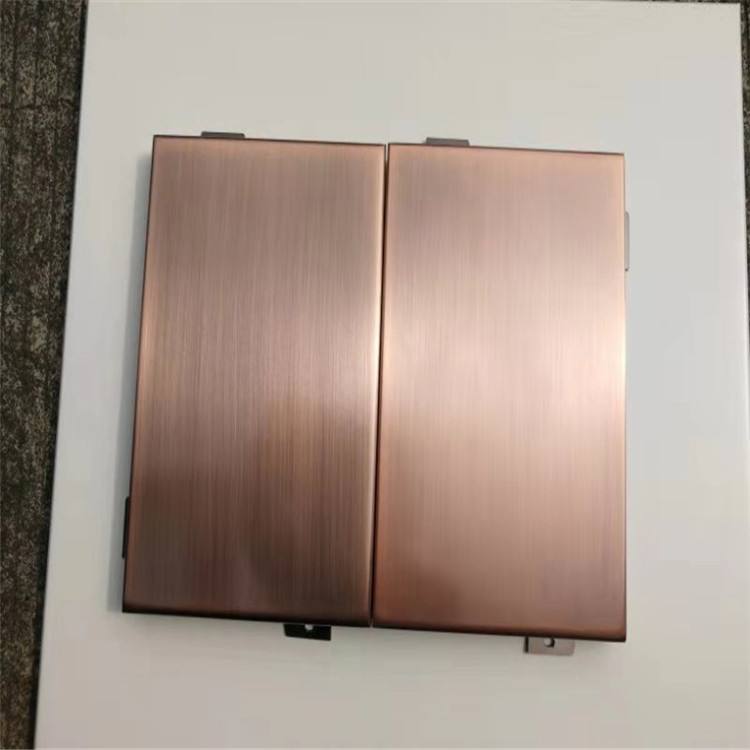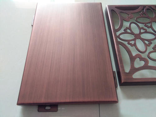 鍍銅拉絲鋁單板采用優(yōu)質高強度合金鋁板,用“三涂二烤”工藝在鋁板上依次噴涂底漆、面漆、顏色漆及透明清漆,并在烘干固化后的仿銅氟碳漆表面進行拉絲工藝處理,氟碳漆仿銅產品圖案具有銅的實物感、立體感,效果逼真,紋理清晰,圖紋牢固耐磨。減少采用銅板裝飾的高額成本,節(jié)約資源,提高經濟效益。