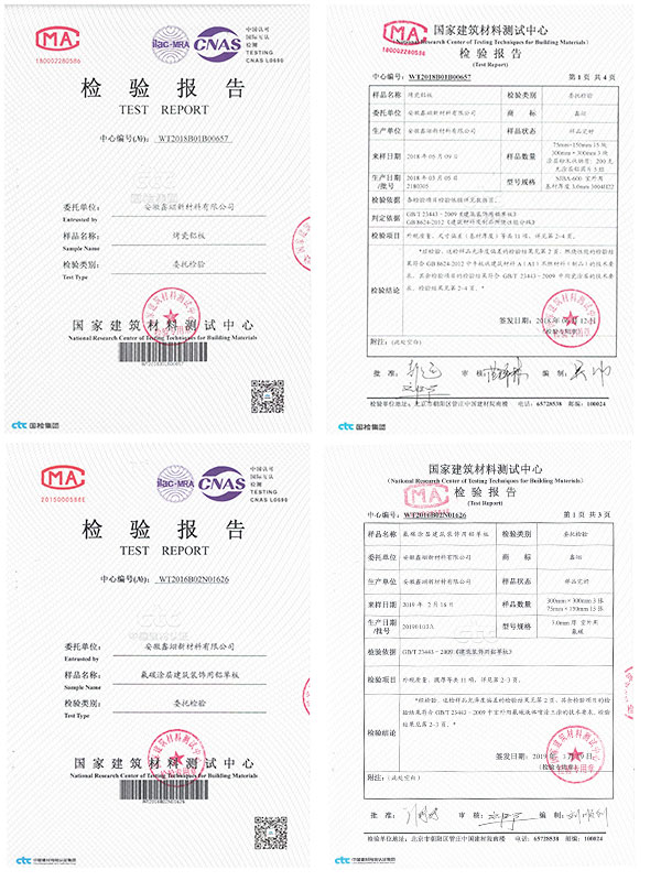 烤瓷鋁板的性能通過國家建筑材料質(zhì)量監(jiān)督檢驗中心檢測,按國家標(biāo)準(zhǔn)GB/T23443-2009《建筑裝飾用鋁單板》的標(biāo)淮得出的數(shù)據(jù),所有的指標(biāo)都是合格,特別其硬度達(dá)到6H以上。防火性能通過國家防火建筑材料質(zhì)量監(jiān)督檢驗中心檢測,按國家標(biāo)準(zhǔn)BB/T8624-2006《建筑材料及制品燃燒性能分級》的標(biāo)準(zhǔn)得出數(shù)據(jù),其防火性能A1級。
