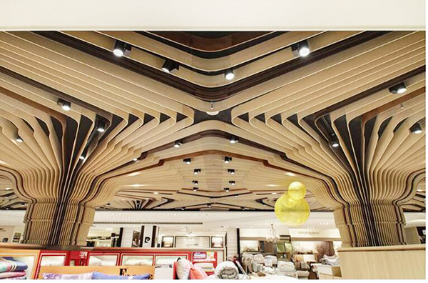 弧形鋁方通可根據(jù)現(xiàn)場定制不同彎度,造型獨特,可解決過道彎曲裝修問題,為業(yè)主提供更多的裝修方案。