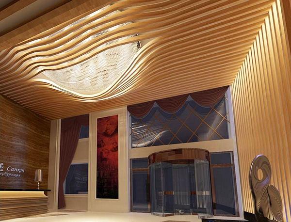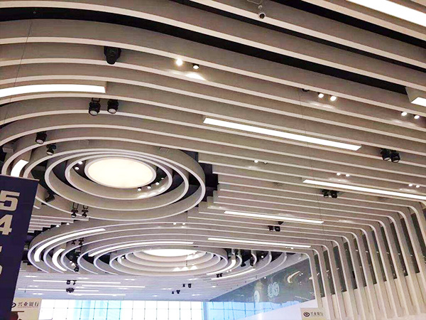 弧形鋁方通吊頂?shù)脑O(shè)計,有基本的兩點要求,一個是底寬的要求,另一個是厚度的基本要求。兩者都是因為加工工藝的限制從而受到限制,波浪造型鋁方通吊頂?shù)牡讓挘话憬ㄗh在30mm以上,小30mm,因為波浪造型鋁方通吊頂,是通過電焊固定成型的,電焊的過程中,需要保證整個鋁方通的平直度,如果底寬太小,電焊加工的過程中很容易造成歪曲,從而影響整根鋁方通的效果,其次,厚度的基本要求,是因為波浪造型鋁方通吊頂燒焊加工而成,燒焊的焊點比較多,溫度較高,如果是太薄的板子,一燒焊就穿了,這樣自然是加工不了的,因而波浪造型鋁方通吊頂厚度要求在2.0mm以上